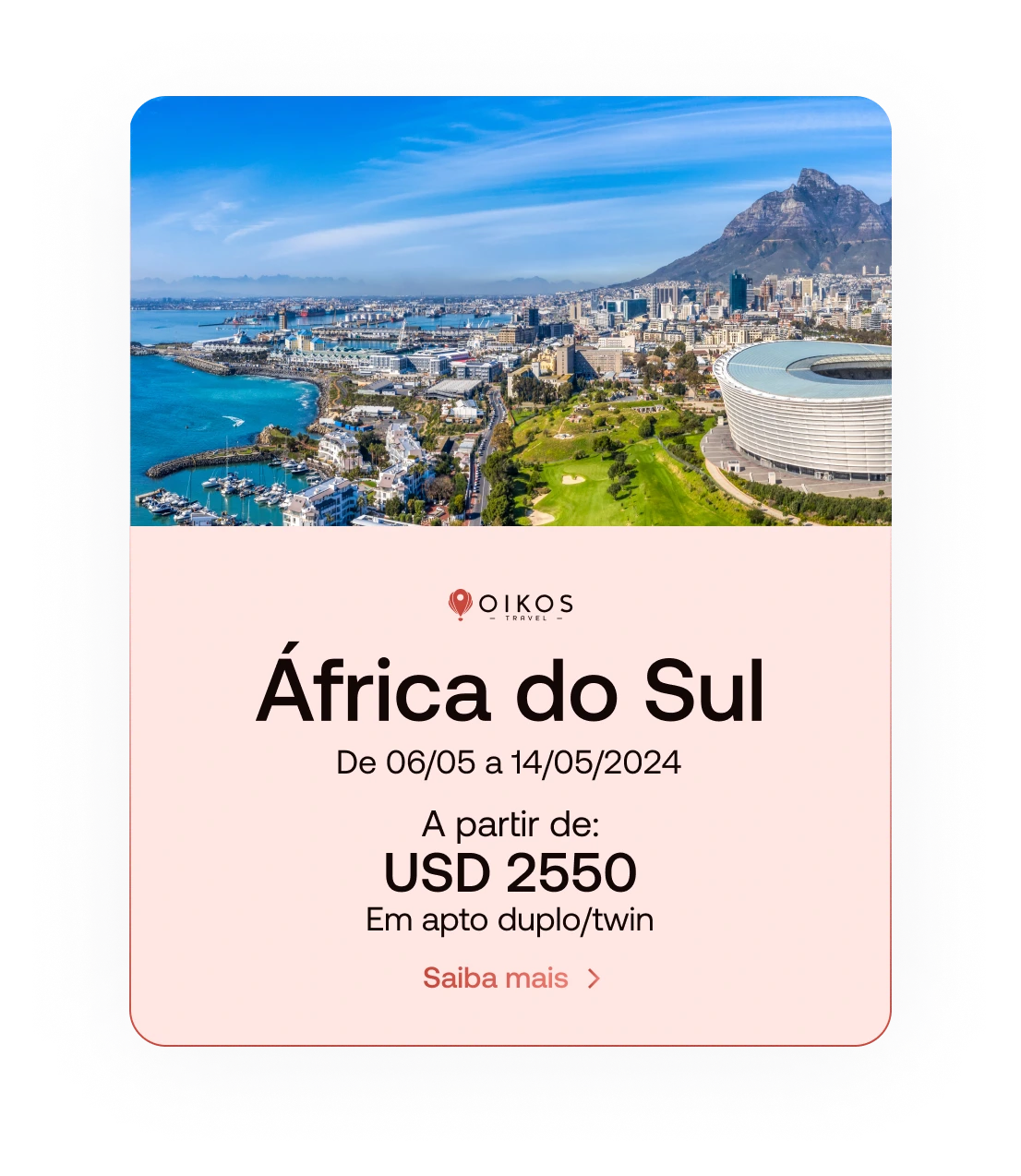 Com mais de 20 anos de experiência na curadoria de roteiros, a Oikos Travel selecionou minuciosamente cada destaque para proporcionar uma jornada que marcará sua vida. Em Johannesburg, você mergulhará no coração do Soweto e visitará o impactante Museu do Apartheid. De lá, partiremos para o Parque Nacional Pilanesberg onde ficaremos por duas noites no deslumbrante Black Rhino Game Reserve, com quatro safáris para maximizar nossas chances de avistar os Big Five. Já em Cape Town, conquistaremos o topo da majestosa Table Mountain, exploraremos o fascinante Cape Point Tour e Cabo da Boa Esperança e além de uma experiência única nas vinícolas do Cabo, com três degustações de vinhos que encantarão seu paladar. Tudo isso com acompanhamento integral de um guia brasileiro experiente. Prepare-se para uma jornada única que é a marca registrada do nosso compromisso com qualidade e excelência em viagens.
