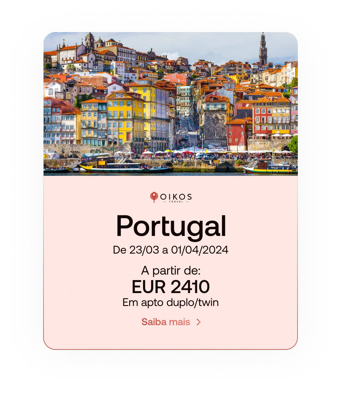 Embarque em uma jornada única e inesquecível por Portugal com o Grupo Portugal 2024 da Oikos Travel. Este é um convite para explorar as riquezas de uma nação repleta de história, espiritualidade, vinhos premiados, gastronomia irresistível e uma cultura vibrante. De Lisboa ao Porto, do Vale do Douro a Fátima, cada destino é meticulosamente selecionado para proporcionar uma experiência que transcende as fronteiras do turismo convencional. Embarque conosco em uma imersão no coração de cidades históricas, deguste vinhos finos nas vinícolas pitorescas, explore monumentos que contam séculos de narrativas e vivencie a espiritualidade única de Fátima. Acompanhados por guias especializados, garantimos uma viagem onde qualidade, excelência e autenticidade se entrelaçam para criar memórias que ecoarão por toda a vida. Venha fazer parte dessa jornada extraordinária e descubra os encantos que tornam Portugal uma pérola no mapa das experiências de viagem.
